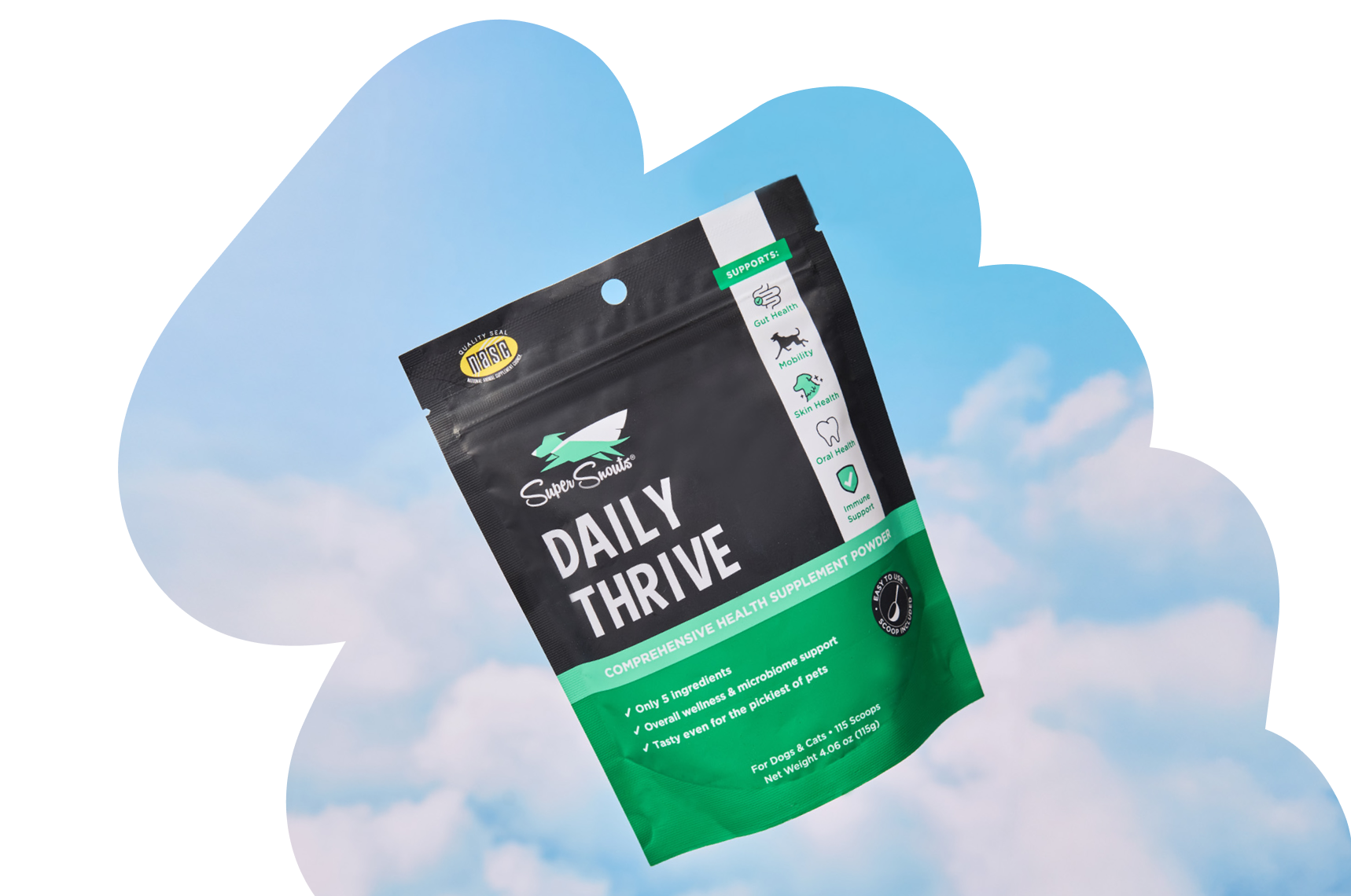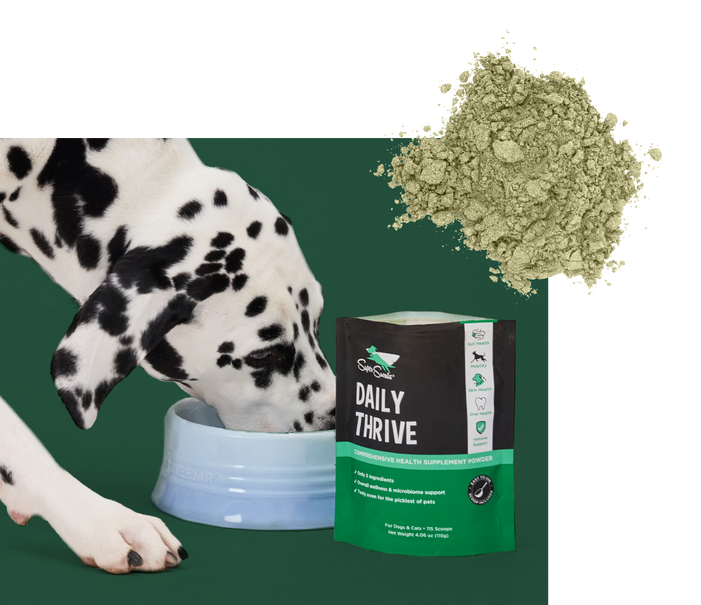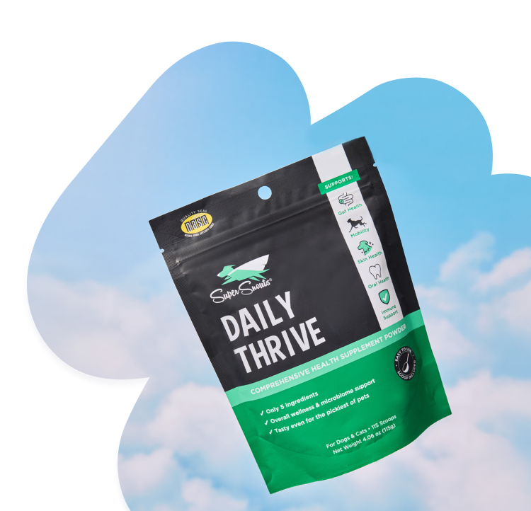 Daily Thrive powder combines just 5 powerhouse ingredients to support 8 essential areas of your pet’s health – all in one supplement.